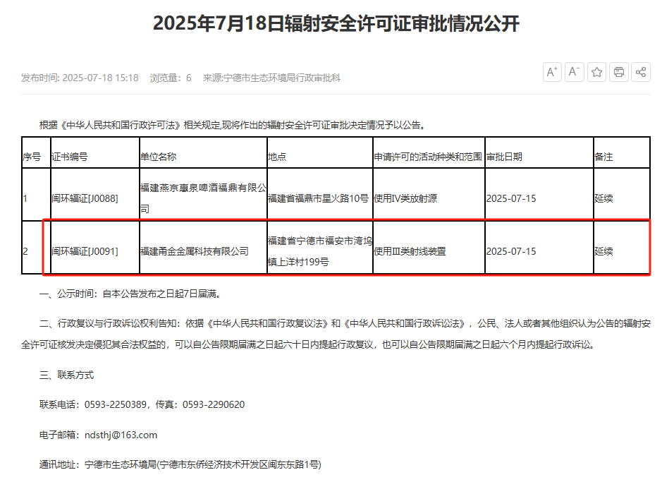 據(jù)顯示,福建甬金金屬科技有限公司使用Ⅲ類(lèi)射線裝置輻射安全許可證于2025年7月15日獲審批通過(guò)。
