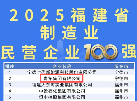 會(huì)上發(fā)布了2025福建省民營(yíng)企業(yè)100強(qiáng)、制造業(yè)民營(yíng)企業(yè)100強(qiáng)、服務(wù)業(yè)民營(yíng)企業(yè)100強(qiáng)、創(chuàng)新型民營(yíng)企業(yè)100強(qiáng)四個(gè)榜單,其中,青拓集團(tuán)憑借其卓越的經(jīng)營(yíng)業(yè)績(jī)和強(qiáng)大的綜合實(shí)力,再次脫穎而出,榮獲福建省民營(yíng)企業(yè)100強(qiáng)第二名和制造業(yè)民營(yíng)企業(yè)100強(qiáng)第二名的優(yōu)異成績(jī)。
