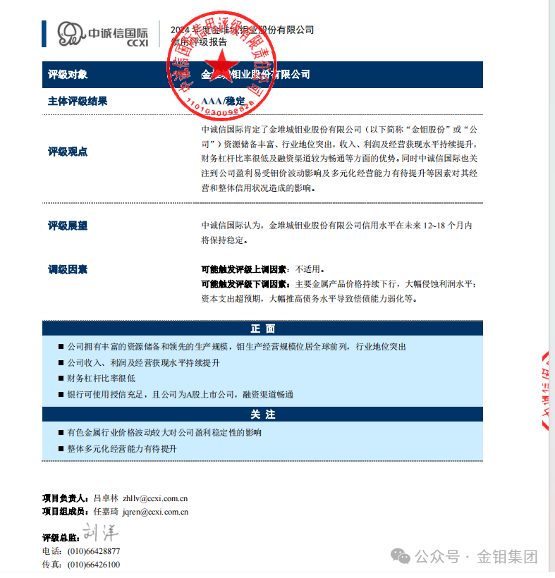 近日,金堆城鉬業股份有限公司榮獲國內權威信用評級機構中誠信國際信用評級有限責任公司AAA主體信用評級。這是金鉬股份首次參與外部評級,并獲得主體信用評級AAA的最高等級。